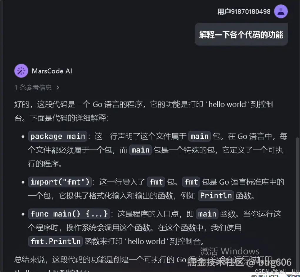 package main:这一行声明了这个文件属于main包。在 Go 语言中,每个文件都必须属于一个包,而main包是一个特殊的包,它定义了一个可执行的程序。import("fmt"):这一行导入了fmt包。fmt包是 Go 语言标准库中的一个包,它提供了格式化输入和输出的函数,例如Println函数。func main() {...}:这是程序的入口点,即main函数。当你运行这个程序时,操作系统会调用这个函数。在这个函数中,我们使用fmt.Println函数来打印 "hello world" 到控制台。