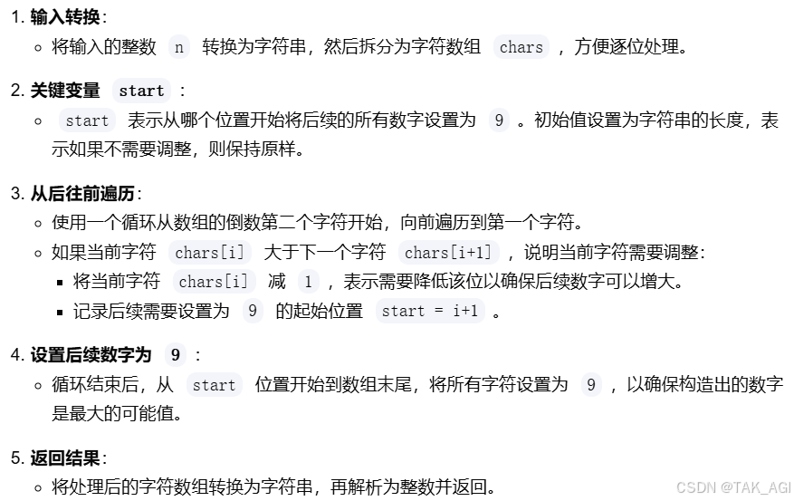 题目要求小于等于N的最大单调递增的整数,那么我们通过识别需要调整的位置,并将后续的数字设置为 9,从而构造出满足条件的最大数字