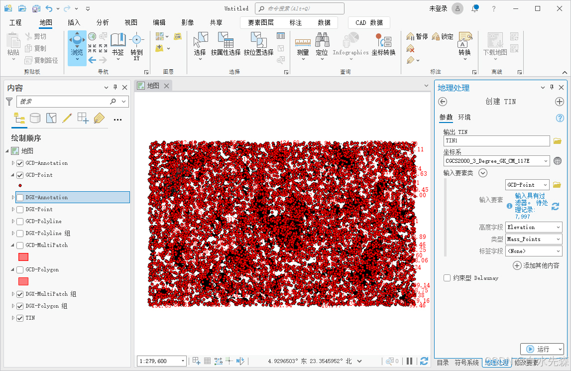 高程点数据:高程点代表地表上的具体高程位置,同样用于TIN的生成。确保高程点数据包含有效的高程值,并评估数据的密度与分布,以确保生成的TIN能够准确反映地形特征。