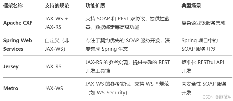 服务接口则通过 WSDL(Web Services Description Language) 描述,客户端可通过 WSDL 自动生成代码调用服务。