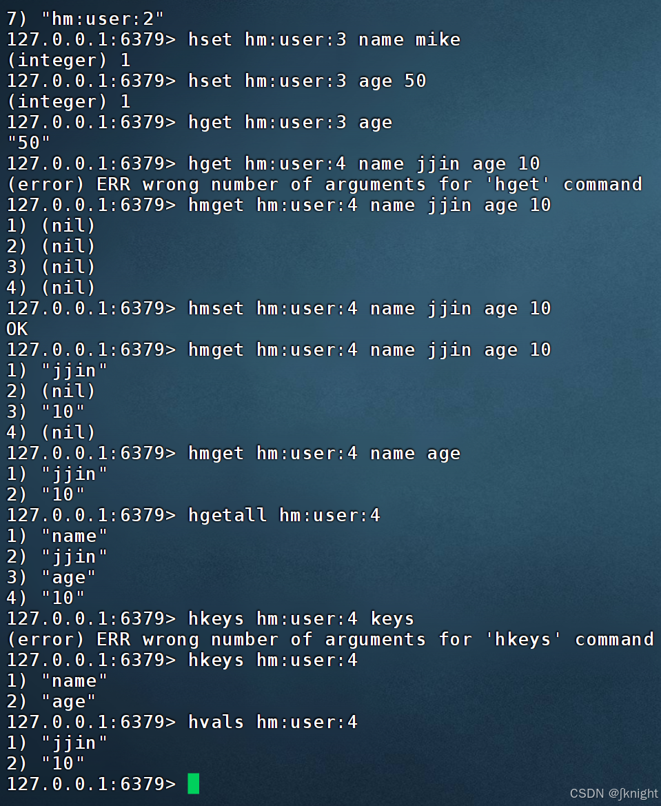 hgetall:获取一个hash类型的key中所有field和value