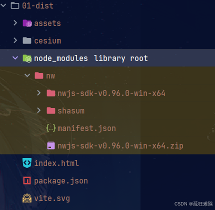 没有nwjs-v0.96.0-win-x6目录了。然后,笔者发现这里面既有src,又有node_modes,难道这是个项目,因此。笔者打开package.json,在script中,发现了一个脚本postinstall