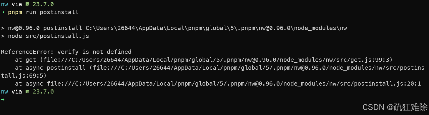 Error: spawn C:\Users\26644\AppData\Local\pnpm\global\5\.pnpm\nw@0.96.0\node_modules\nw\nwjs-v0.96.0-win-x64\nw.exe ENOENT
