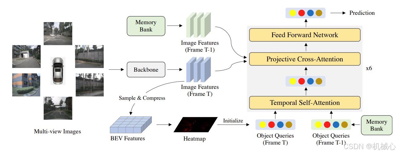 三个模块的含义:MLN是对目标特征Qc进行归一化和基于运动补偿的变换,MLN只对Qc进行处理,其他query参数保持不变。Hybrid Attention模块首先对Propagated Query和Initial Query做self-attention获得Q',主要是对Propagated Query和Initial Query进行充分融合,生成新的查询充分考虑了当前时刻新的目标信息和历史时刻的目标信息。然后将Memory Queue中的目标信息经过MLN后与生成的新查询Q'进行cross attention,生成新的查询点Q''。将图像特征Ft与Q''送入到CrossAttention模块进行cross attention,其中K叠加了3D position embedding。下图展示的t-1到t是指时间顺序执行。