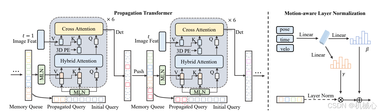 propagation transformer模块主要包括三个部分:MLN模块(Motion-Aware Layer Normalization,运动感知层归一化),Hybrid Attention模块和CrossAttention模块。Transformer的query包括了Propagated query和Initial query,query的维度与目标的维度D是一致的,例如256,所包括的Qc、Qp、速度、变换E和时间间隔。其中Propagated query来自循环记忆队列,Qp根据自身运动变换矩阵E进行了更新,其他的不变,数量为256。Initial query是补充的目标查询点,Qc、Qp以及速度V随机生成,变换E和时间间隔根据里程计进行计算,数量为644,两个query数量合起来为900。