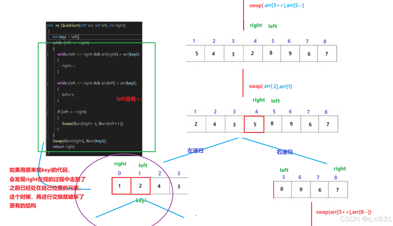 此时如果再使用原来找keyi的方法只会让那两元素不断进行交换造成死递归,通过该图可以发现,这里只要right < keyi,此时的right在该段区间就是属于非法的,所以只需在跳出循环的时候判断两者即可,如果非法返回keyi