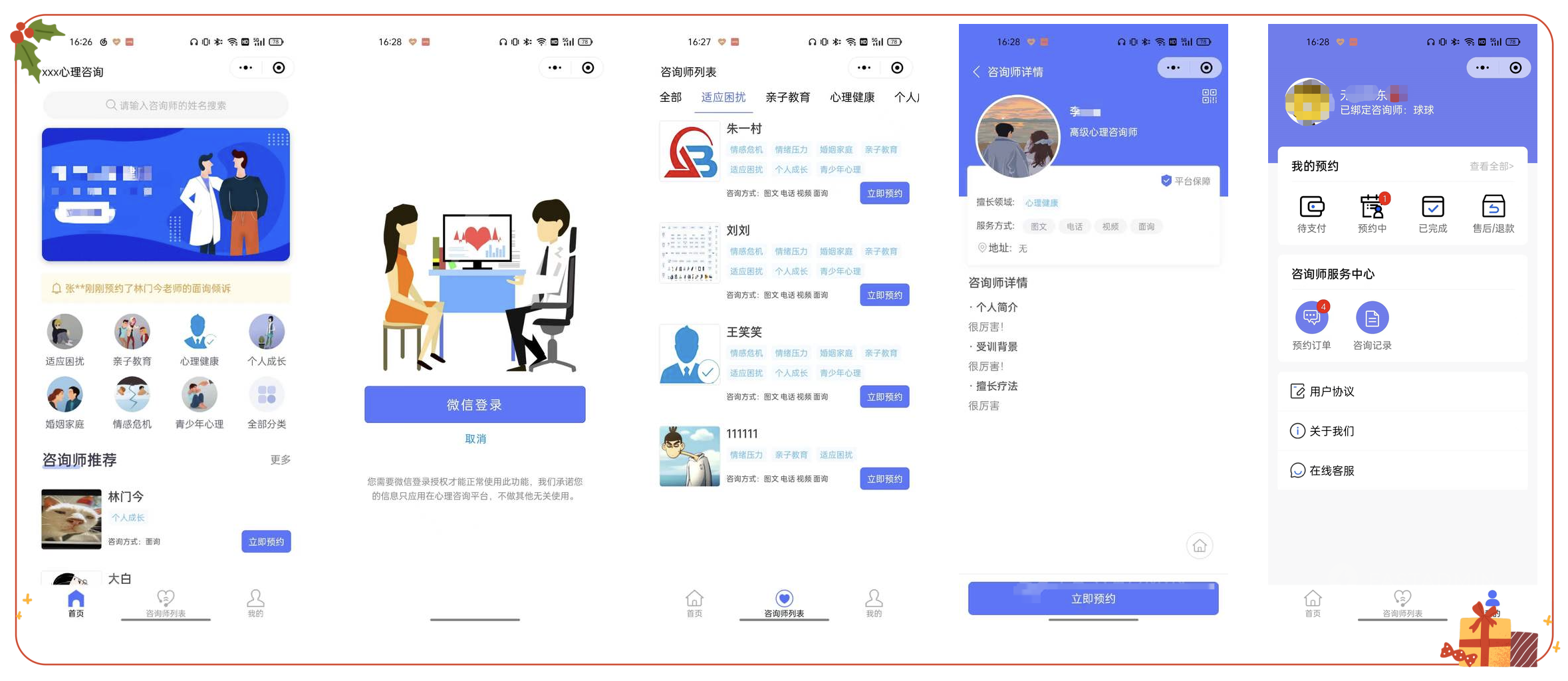 - 用户端:支持微信授权登录、在线预约(时间/咨询师选择)、实时沟通(文字/语音/视频)、订单支付、服务评价等功能。