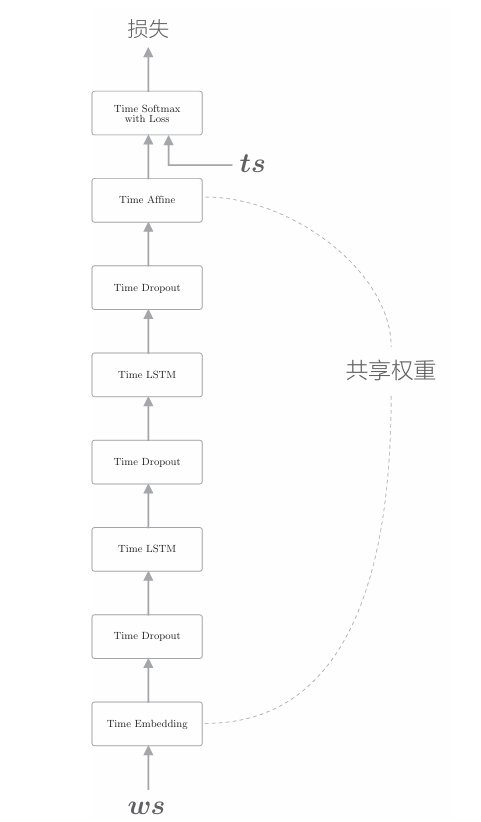 至此,我们介绍了RNNLM的3点有待改进的地方。接下来,我们来看一下这些技巧会在多大程度上有效。这里,将下图的层结构实现为 BetterRnnlm 类