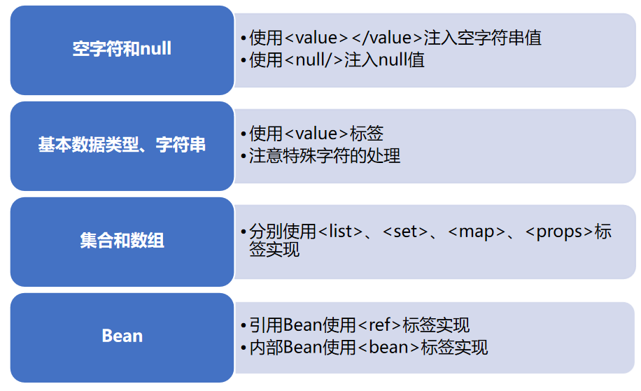 spring支持不同数据类型的注入,具体如下: