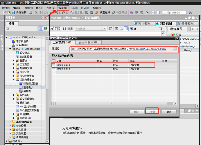 1、点击选项找到"管理通用站描述文件"选择GSD文件所在文件夹路径,选中GSD文件点击安装: