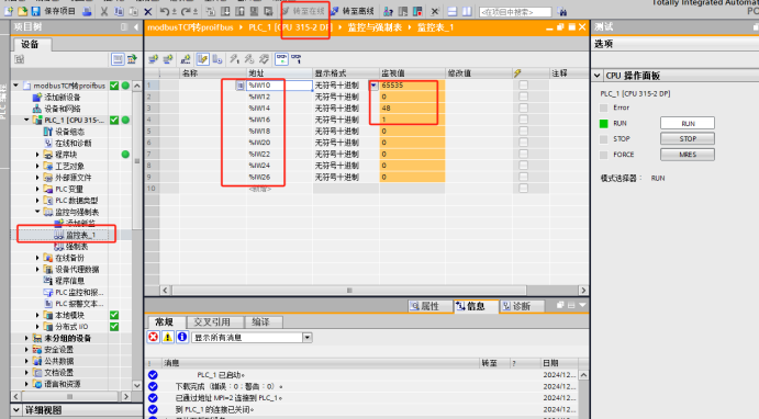 7、下载完成点击转至在线,创建监控表监控从站设备传过来的数据: