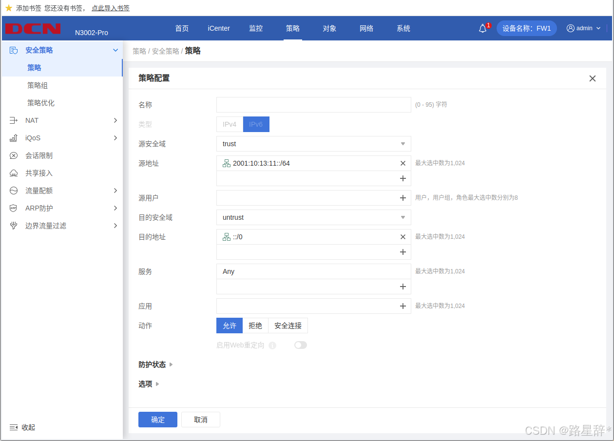 3.FW1 和FW2 策略默认动作为拒绝,FW1 允许集团产品 1 段 ipv4 和ipv6 访问Internet 任意服务。