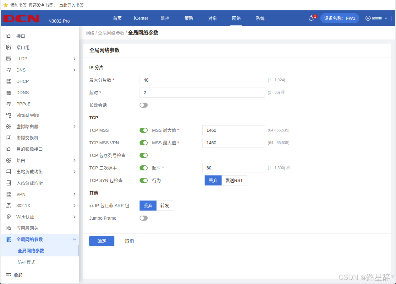 7.FW1 开启安全网关的TCP SYN 包检查功能,只有检查收到 的包为TCP SYN 包后,才建立连接,否则丢弃包;配置对TCP 三次 握 手建立的时间进行检查,如果 1 分钟内未完成三次握手,则断掉该 连 接;配置所有的TCP 数据包和TCP VPN 数据包每次能够传输的最 大数据分段为 1460 ,尽力减少网络分片。