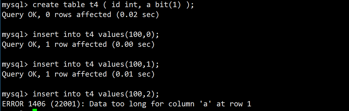 bit[(M)] : 位字段类型。M表示每个值的位数,范围从1到64。如果M被忽略,默认为1。