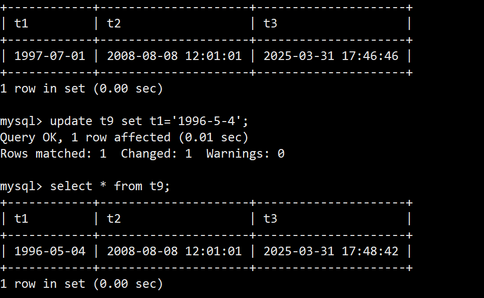 可以看到这里我们没有插入t3的值,但是它却有值,所以timestamp就是一种时间戳当我们插入数据的时候时间戳就会自动补齐。我们再来实验一下