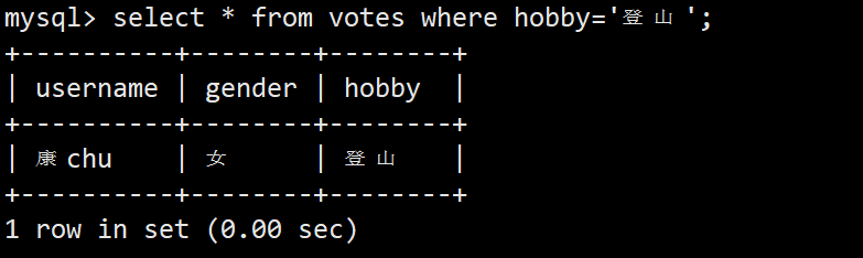 select * from votes where hobby='登山';