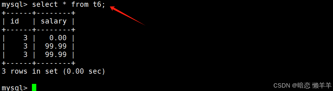 我们创建一张表t10,里面创建一个varchar(6)的name字段