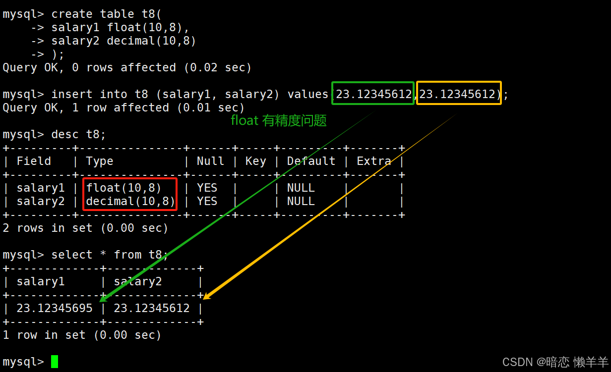 小数类型有 float、doule、decimal其中 float 和 double 差不多或者范围比前者大,我们这里介绍一个 float,而 decimal 与前者的差别是 精度问题。