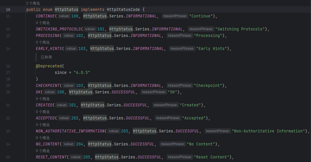 在http状态码枚举类中,每一条状态码概括为三部分