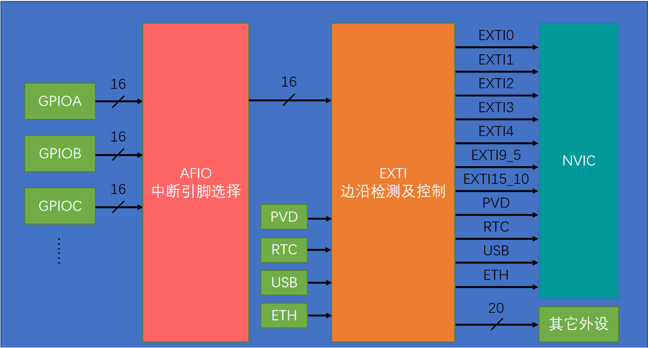 对于GPIO的16个Pin,AFIO从所有GPIO外设中选择其中一个连接到EXTI通道,因此相同的Pin不能同时触发中断。16个Pin和4个外加组成了EXTI的20个输入通道,而输出通道中EXTI的9~5、15~10被分配到一个通道里,需在中断函数中要根据标志位区分到底是哪个中断,20个连接到其他外设的输出通道为事件响应。