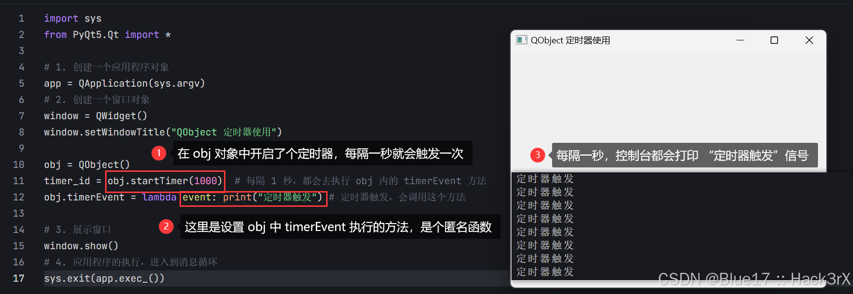timer_id = obj.startTimer(1000) # 每隔 1 秒,都会去执行 obj 内的 timerEvent 方法