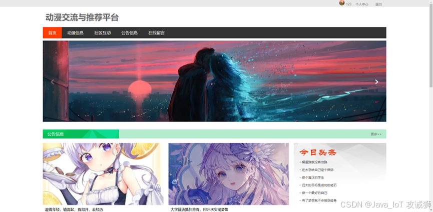 当游客打开系统的网址后,首先看到的就是首页界面。在这里,游客能够看到动漫交流与推荐平台的导航条显示首页、动漫信息、社区互动、公告信息、在线留言、个人中心。在个人中心页面可以修改个人信息、密码修改,还可以对订阅信息、更新信息、我的发布、我的收藏进行详细操作。管理员进入主页面,主要功能包括对系统首页、个人中心、用户管理、动漫分类管理、动漫信息管理、订阅信息管理、更新通知管理、在线留言、社区互动、系统管理等进行操作。