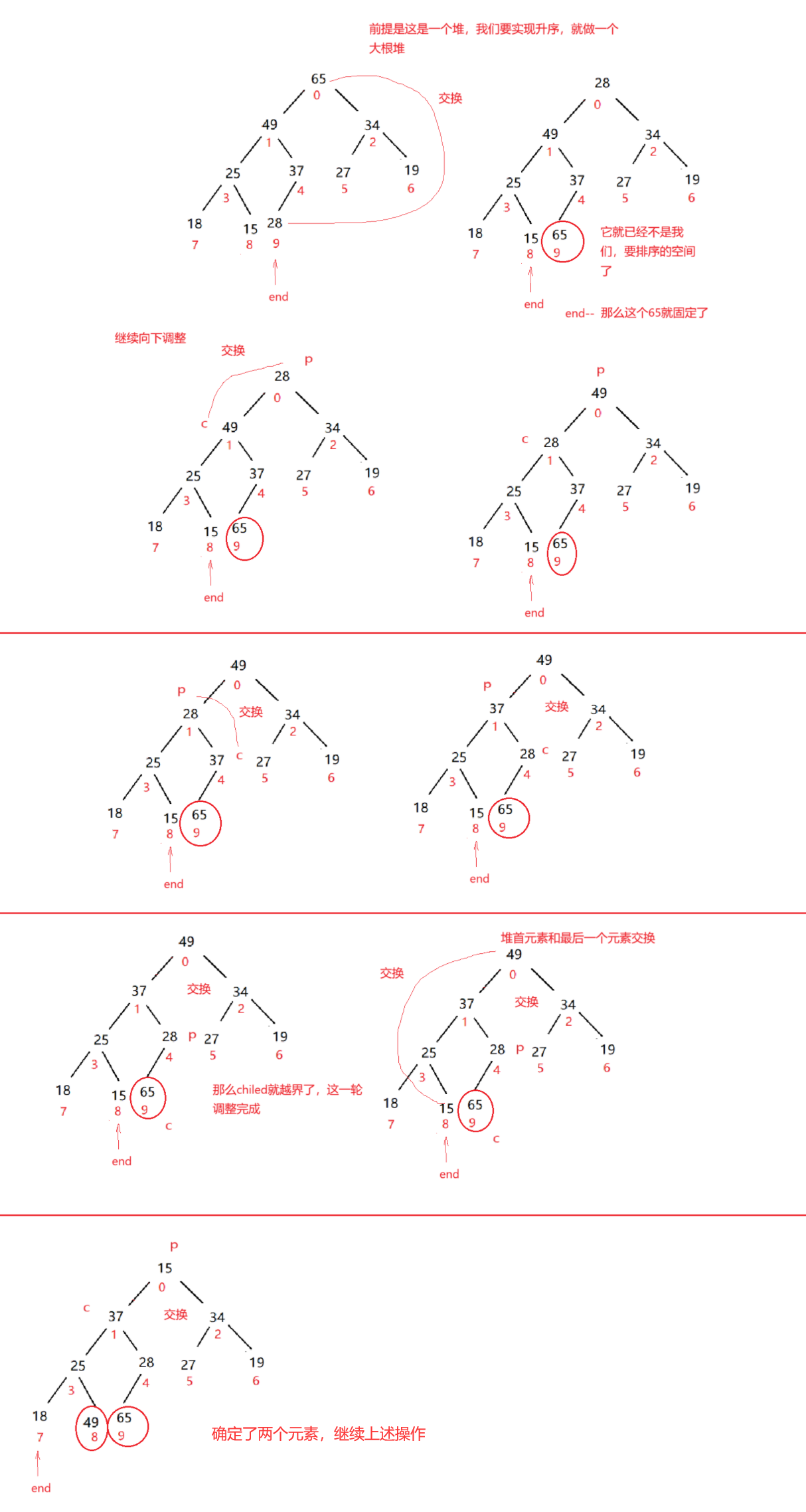经过上面这么多图的讲解,我们现在就知道了,如果是大根堆,堆顶元素一定是最大值,反之就是最小值 。那我们就可以像删除元素那样,把最后第一个元素和最后一个元素交换 ,再进行操作保证仍然是堆,那么现在堆底元素就是最大值。下一次堆顶元素就是第二大的值了,以此类推。