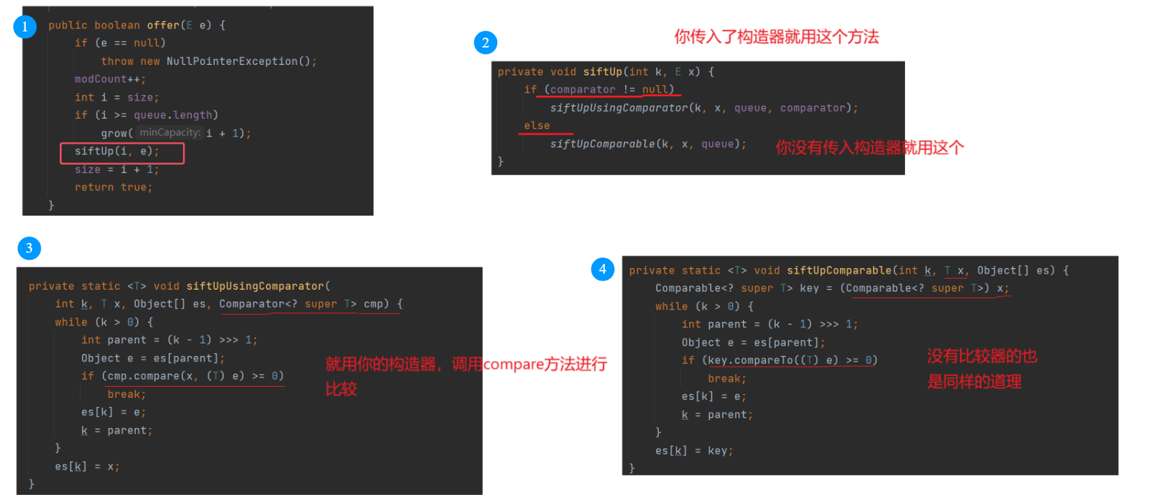 - PriorityQueue中放置的元素必须要能够比较大小,不能插入无法比较大小的对象,否则会抛出ClassCastException异常