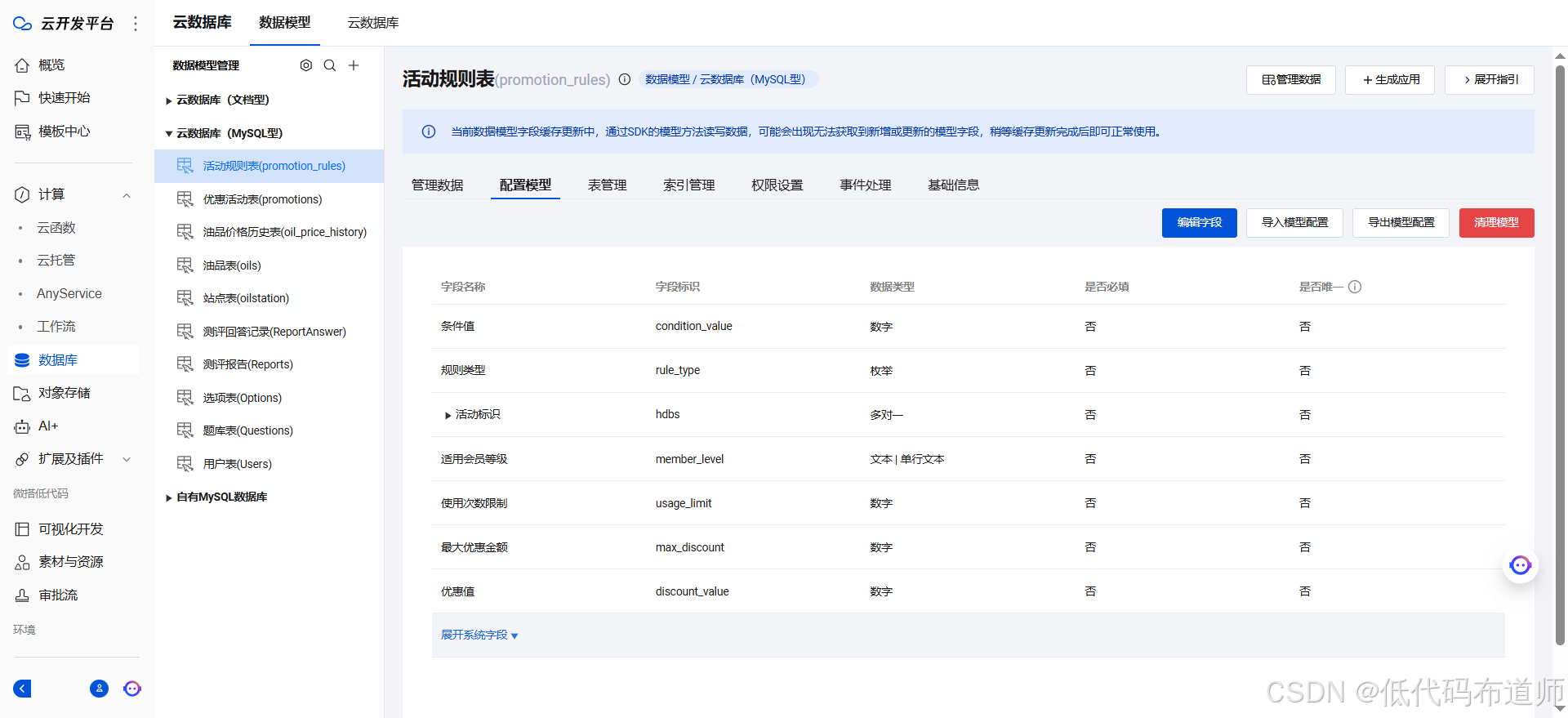 本篇实战教程,我们将实现一下优惠活动管理功能,包括表结构的搭建、后台管理功能搭建以及小程序端展示功能
