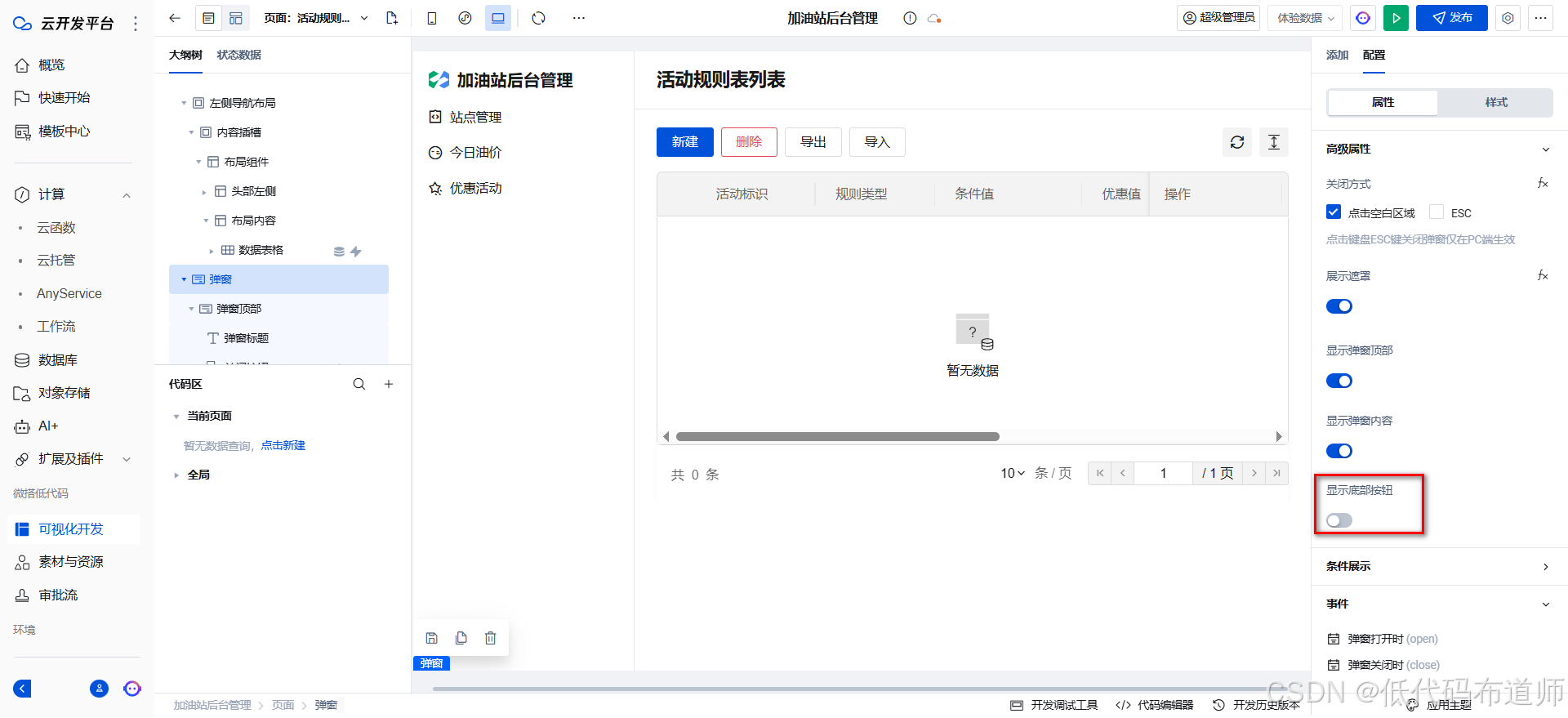 弹窗内容添加表单容器,选择活动规则表