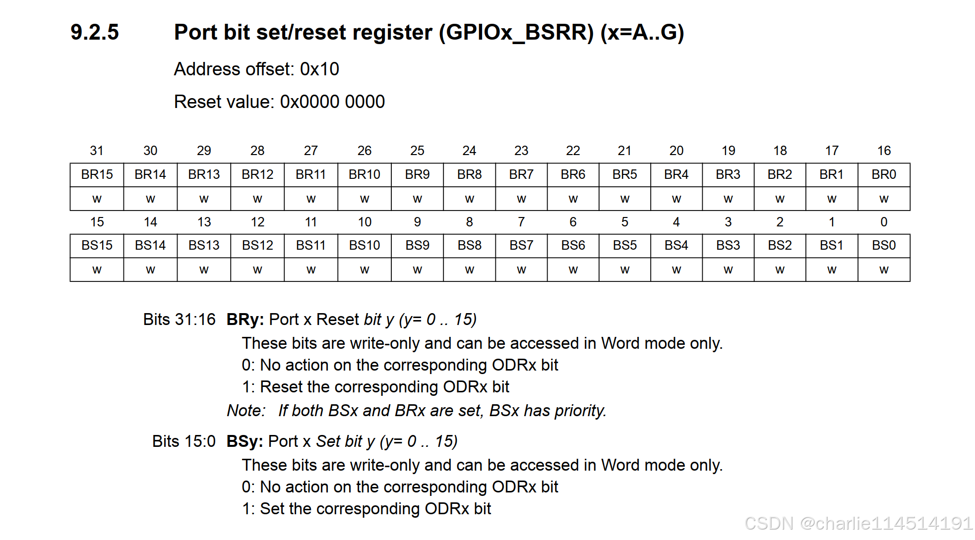 BSRR寄存器是只能写入的,如手册所说!这里我们看到,这个32位的寄存器分成了上下两部分,高16位是Port Reset Bit,也就是说,往这里写东西的时候,对应的Pin上的ODR的位就会被复位为1,反之,则是0.