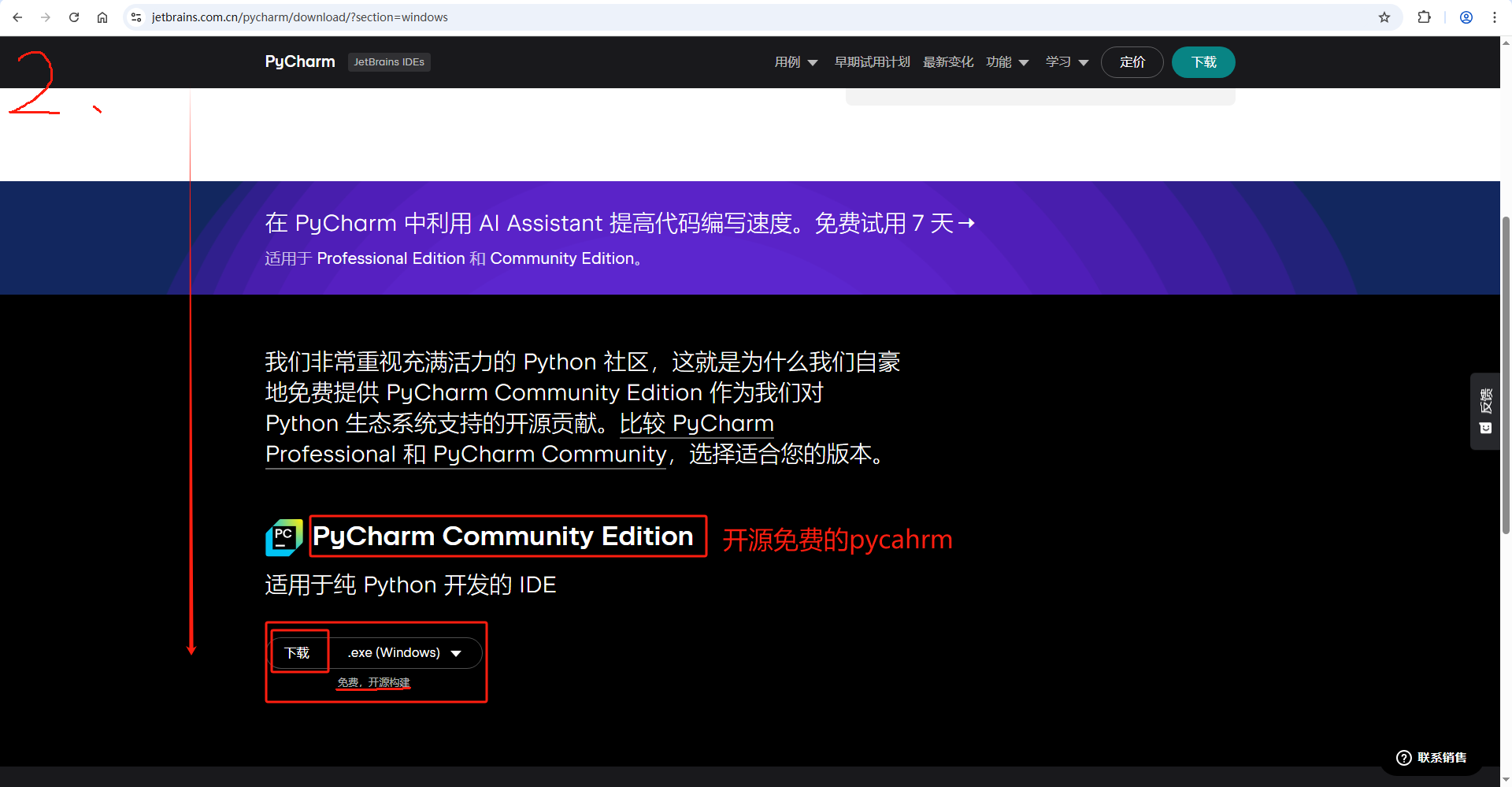进入pycharm官网 https://www.jetbrains.com.cn/pycharm/download/?section=windows,**找到免费版的 pycharm 下载按钮**。