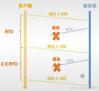 第一个SYN报文丢失 --- 这个报文发送后,客户端进入SYN_SENT状态等待服务器回复ACK。如果这个报文丢失,客户端没有等到回复,超过了RTO超时时间,则触发超时重传机制,客户端再次发送SYN,两次发送内容完全一样。因为是第一次发送数据包,则RTO超时时间的值为定义值,推荐时间为1S。如果再次丢失则触发超时间隔加倍,超时时间RTO为2RTO。如若一直丢失,系统会设置最大重传次数,达到最大重传次数则关闭TCP连接。