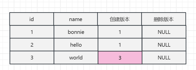 此时的数据,创建版本是当前事务ID,假设事务编号是1, 删除版本为空