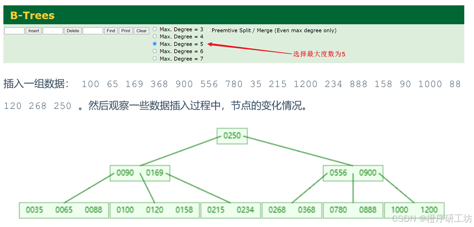 以一颗最大度数(max-degree)为5(5阶)的b-tree为例,那这个B树每个节点最多存储4个key,5 个指针: