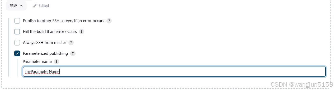 在Send files or execute commands over SSH----高级-----Parameterized publishing---填入上一步的参数名称