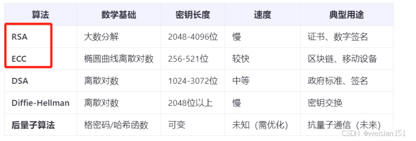 - ECC:高效且短密钥,适合现代场景。