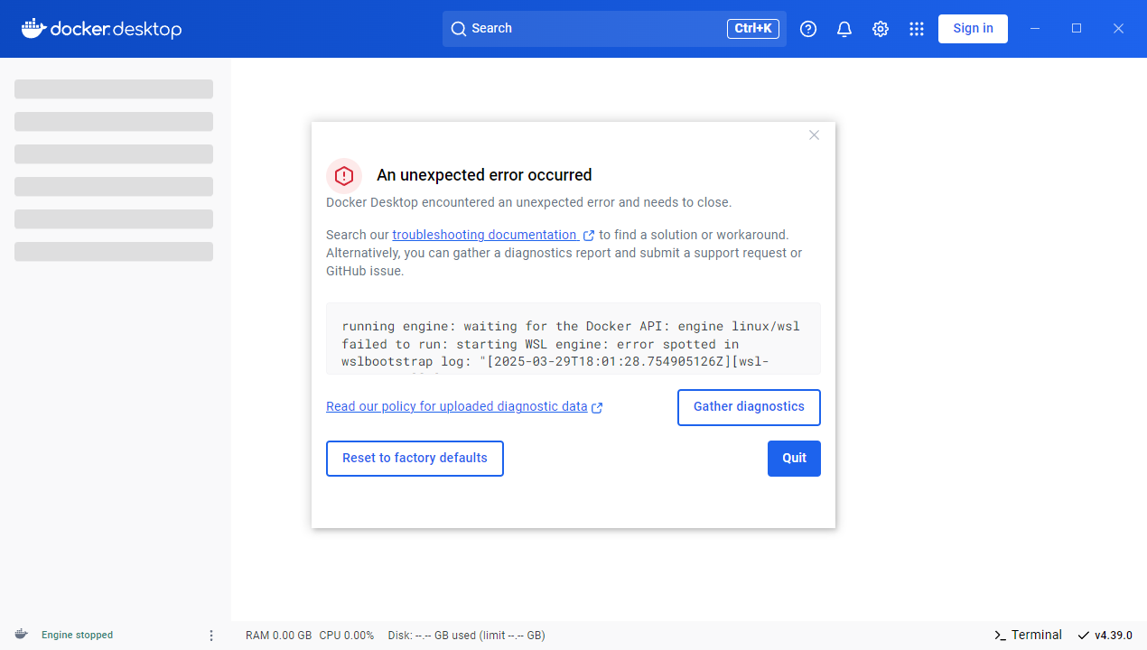 Docker Desktop encountered an unexpected error and needs to close.