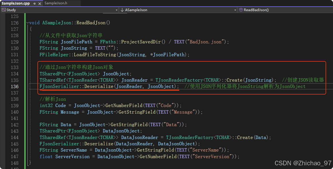 FJsonSerializer::Deserialize(JsonReader, JsonObject); //使用JSON序列化器将JsonString解析为JsonObject