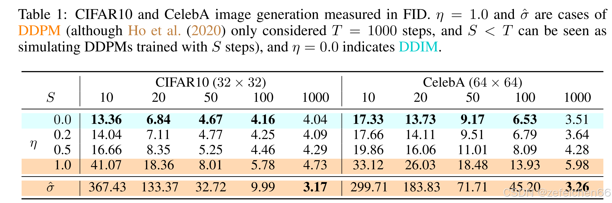 论文讨论了 σ t 2 \sigma_t^2 σt2选取 η ⋅ 1 − α t − 1 1 − α t ⋅ ( 1 − α t α t − 1 ) , η ∈ [ 0 , 1 ] \eta\cdot \frac{1-\alpha_{t-1}}{1-\alpha_t}\cdot (1-\frac{\alpha_t}{\alpha_{t-1}}),\eta\in[0,1] η⋅1−αt1−αt−1⋅(1−αt−1αt),η∈[0,1],即在0和DDPM之间变化时。不同 η \eta η以及跳不同步时所对应的表现,如下图所示。