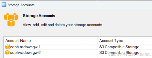 ceph: root@ceph01 /\]# radosgw-admin zone modify --rgw-zone=zonegroup1-zone1 --access-key=1VJ4SIXDJ2AK1RTC2END --secret=CkfKaVFP1KFG1IE08bl6yTAbQyLqlqQTALG07Q8k 7. 更新period期限 更新主区域配置后,更新周期。 \[ceph: root@ceph01 /\]# radosgw-admin period update --commit 更新周期会改变纪元,并确保其他区域将收到更新的配置。 8. 更新 Ceph 配置文件 通过将配置选项rgw_zone和主区域的名称添加到实例条目来更新主区域主机上的 Ceph 配置文件 /etc/ceph/ceph.conf 增加如下内容: [client.rgw.ceph01] host = ceph01 rgw frontends = "ceph_rgw_web port=80" rgw_zone=zonegroup1-zone1 9. 启动网关,使配置变更生效。 在对象网关主机上(ceph01)(非cephadm shell),重启 Ceph 对象网关服务: \[root@ceph01 \~\]# systemctl restart $(systemctl list-units \|awk '/rgw/ {print $1}') #### 配置次要区域 区域组内的区域会复制所有数据,以确保每个区域的数据相同。 创建辅助区域时,请在指定为辅助区域提供服务的主机上运行下列操作。 要添加第二个次要区域(即,已包含次要区域的区域组中的第二个非主区域),请按照添加次要区域的相同步骤操作。请确保指定与第一个次要区域不同的区域名称。 元数据操作(例如,创建用户)必须在主区域内的主机上运行。 存储桶操作可以由主区域或辅助区域接收,但辅助区域会将存储桶操作重定向到主区域。如果主区域关闭,存储桶操作将失败。 1. 部署rgw服务 [root@ceph-a ~]# cephadm shell [ceph: root@ceph-a /]# ceph orch host label add ceph-a rgw Added label rgw to host ceph-a [ceph: root@ceph-a /]# ceph orch apply rgw rgw-test --placement="label:rgw count-per-host:1" --port=80 Scheduled rgw.rgw-test update...  2. 拉取 Realm 配置 需指定主区域组中主区域的 URL 路径、access-key和secret-key用于将领域配置拉取到主机。 拉取非默认领域的配置时,请使用 --rgw-realm或--realm-id配置选项指定领域。 拉取领域配置还会检索远程的当时期epoch配置,并使其成为此主机上的当前时期。 [ceph: root@ceph-a /]# radosgw-admin realm pull \ --url=http://192.168.61.11:80 \ --access-key=1VJ4SIXDJ2AK1RTC2END \ --secret-key=CkfKaVFP1KFG1IE08bl6yTAbQyLqlqQTALG07Q8k { "id": "609faf9b-309f-42d7-af11-f5881a869163", "name": "rgw-realm-1", "current_period": "826d16fc-1b21-4439-b866-6cc482497ec2", "epoch": 2 } 2025-02-09T12:37:07.992+0000 7ff94db4a7c0 1 Set the period's master zonegroup zonegroup1 as the default 如果此领域是唯一的领域,请运行以下命令使其成为默认领域: [ceph: root@ceph-a /]# radosgw-admin realm default --rgw-realm=rgw-realm-1 3. 创建辅助区域 创建区域时,它必须位于区域内的Ceph对象网关节点上 指定区域组 ID、新区域名称和区域的端点。 请勿使用--master或--default标志。 从 Kraken 开始,所有区域默认以主动-主动配置运行,这意味着网关客户端可以将数据写入任何区域,并且该区域将数据复制到区域组内的所有其他区域。 如果要阻止辅助区域接受写入操作,请--read-only在命令中包含标志,以便在主区域和辅助区域之间创建主动-被动配置。 无论如何,不要忘记提供存储在主区域组的主区域中的生成的系统用户的access_key和secret_key。 [ceph: root@ceph-a /]# radosgw-admin zone create \ --rgw-zonegroup=zonegroup1 \ --rgw-zone=zonegroup1-zone2 \ --access-key=1VJ4SIXDJ2AK1RTC2END \ --secret=CkfKaVFP1KFG1IE08bl6yTAbQyLqlqQTALG07Q8k \ --endpoints=http://192.168.61.31:80 以下步骤假设多站点配置使用新安装且尚未开始存储数据的系统。 如果您已使用该区域或其池来存储数据,请勿删除该 default 区域或其池,否则数据将不可挽回地丢失。 如果需要,删除默认区域: [ceph: root@ceph-a /]# radosgw-admin zone delete --rgw-zone=default 2025-02-09T12:39:32.402+0000 7f23283c77c0 0 NOTICE: removed master_zone of zonegroup default 2025-02-09T12:39:32.405+0000 7f23283c77c0 0 Removed zone from zonegroup default 开启删除开关,否则会提示无法删除 [ceph: root@ceph01 /]# ceph config set mon mon_allow_pool_delete true 如果需要,删除 Ceph 存储集群中的默认池: ceph osd pool rm default.rgw.control default.rgw.control --yes-i-really-really-mean-it ceph osd pool rm default.rgw.data.root default.rgw.data.root --yes-i-really-really-mean-it ceph osd pool rm default.rgw.gc default.rgw.gc --yes-i-really-really-mean-it ceph osd pool rm default.rgw.log default.rgw.log --yes-i-really-really-mean-it ceph osd pool rm default.rgw.users.uid default.rgw.users.uid --yes-i-really-really-mean-it 4. 更新 Ceph 配置文件 /etc/ceph/ceph.conf [client.rgw.ceph-a] host = ceph-a rgw frontends = "ceph_rgw_web port=80" rgw_zone=zonegroup1-zone2 5. 更新辅助区域配置后,更新周期: [ceph: root@ceph-a /]# radosgw-admin period update --commit 更新周期会改变纪元,并确保其他区域将收到更新的配置 6. 重启网关服务 在对象网关主机上(ceph-a)(非cephadm shell),启动并启用 Ceph 对象网关服务: [root@ceph-a ~]# systemctl restart $(systemctl list-units |awk '/rgw/ {print $1}') 7. 检查同步状态 [ceph: root@ceph-a /]# radosgw-admin sync status  ### S3对象文件同步测试 使用window系统下的S3 Browser工具软件进行测试。 下载地址:https://s3browser.com/ 安装完成后打开配置账号,可以使用上面章节中创建的用于同步的账户sync-user的access_key和secret_key。  创建2个账户,对应2个ceph集群。  在集群1中创建bucket,上传文件,切换到集群2,可以看到bucket及文件已经同步。 在集群2中创建bucket并上传文件,切换到集群2,文件也是可以同步的。