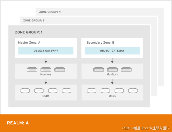 在Ceph RGW的多站点复制架构中,Realm、Zonegroup 和 Zone 是关键的组织结构,用于管理多站点的配置和数据同步