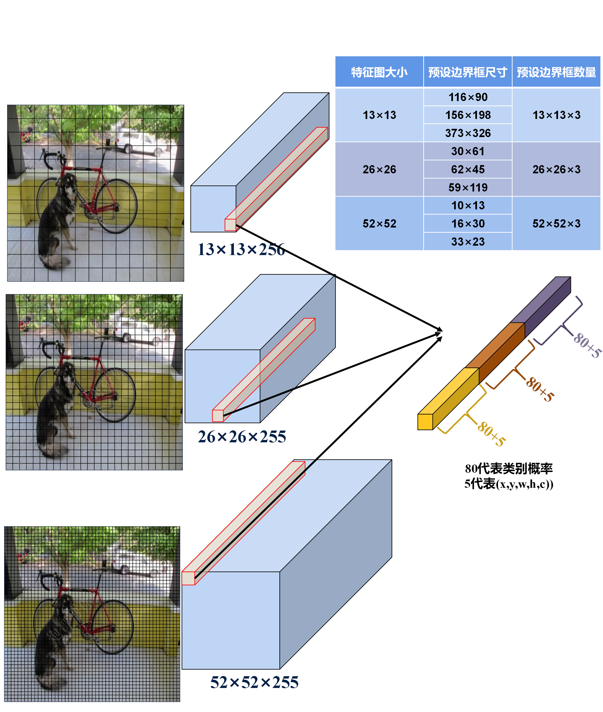 - 边界框预测: 每个检测头基于一组(3个)预选框(anchor boxes)负责预测边界框,预测预选框相对于真实框(ground truth)的偏移和缩放来确定边界框位置,预测框中目标存在的概率以及目标类别的概率来确定边界框的类别。
