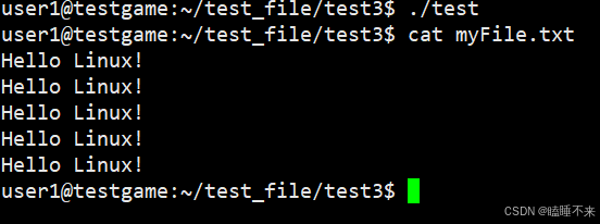 如果我们关闭 fd 为 1 的文件,也就是关闭 stdout 文件,再打开 myFile.txt 文件并用 printf 函数打印,原本输出到显示屏的内容会输出到 myFile.txt 文件中: