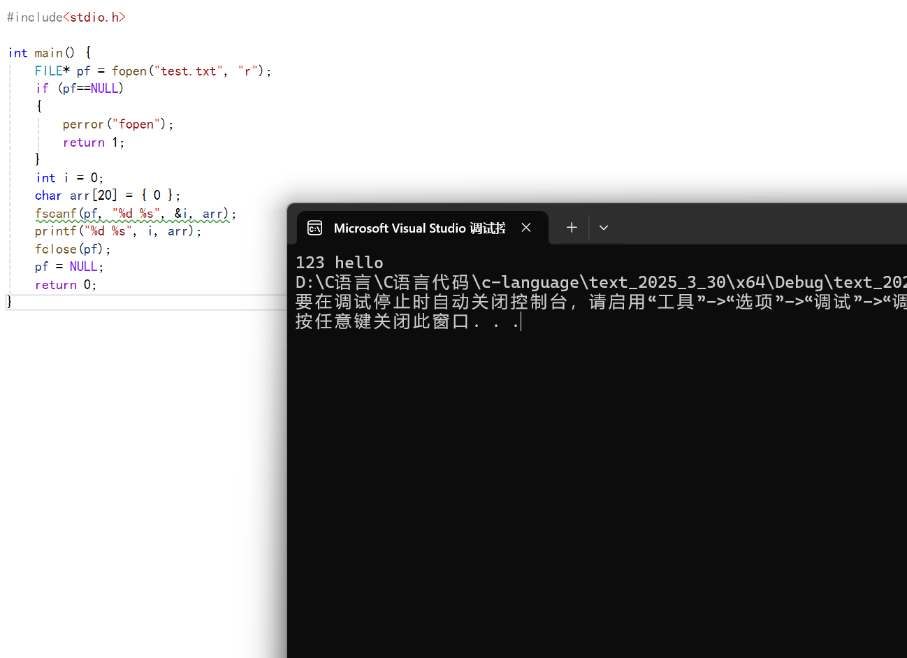 当前文件夹中有一个test.txt文件,里面包含的数据有:123hello,现在我们要以格式化的方式将它们读取出来,也就是将123读取为整型,hello读取为字符串。
