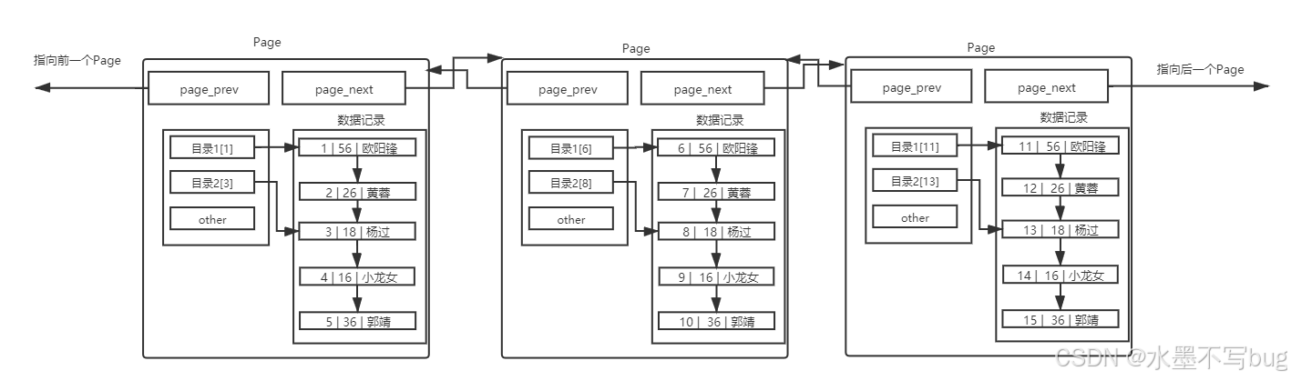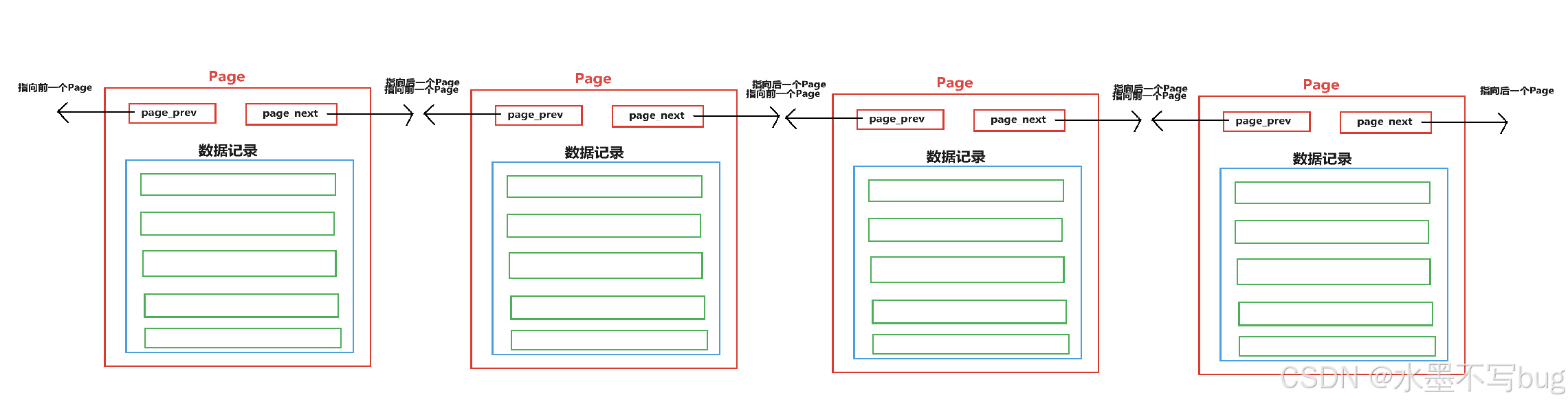 不同的 Page ,在 MySQL 中,都是 16KB ,使用 prev 和 next 构成双向链表。