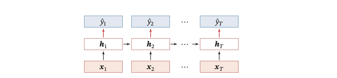 时间步对齐:输入和输出长度一致,每个时间步的输出不仅依赖当前输入,还受前面时间步隐藏状态影响。