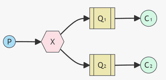 · P:生产者,也就是要发送消息的程序,但是不再发送到队列中,而是发给X(交换机)