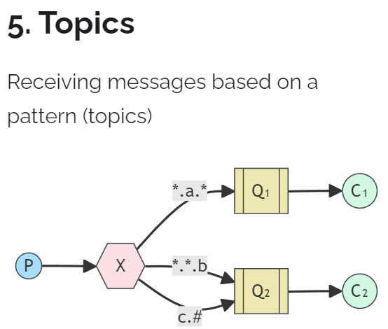 o Topic:通配符,把消息交给符合routing pattern(路由模式) 的队列