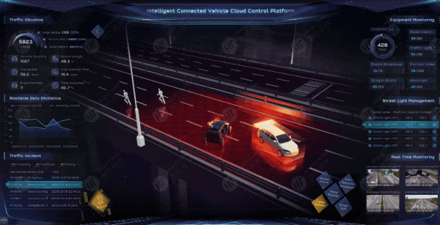 在车联网云控平台中,页面左下角实时交通事件列表以简洁直观的表格形式呈现,按时间顺序依次罗列交通事件,事件类型用不同颜色标识区分,点击具体事件条目,可关联三维场景中对应的交通事件模拟动画展示,还能弹出详细信息弹窗,包含事故现场照片、初步调查结果等。
